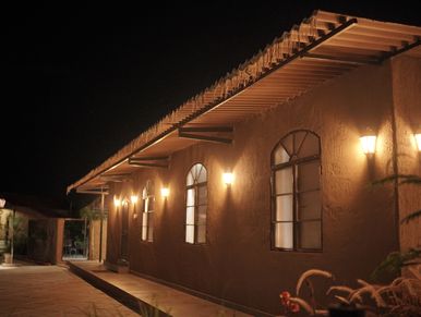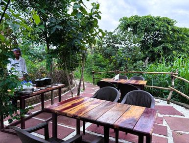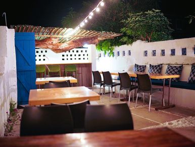 Tucked away in a quiet village, this dining area captures the charm of Santorini with its whitewashed walls, blue-accented décor, and open-air seating that glows under the soft golden light of sunset. Tables set beneath pergolas draped with vines, terracotta pots overflowing with flowers, and gentle music blending with the hum of village life. Guests can enjoy Private Family dinner here. The atmosphere feels both exotic and familiar, offering a touch of Mediterranean magic in the heart of a peaceful countryside setting.